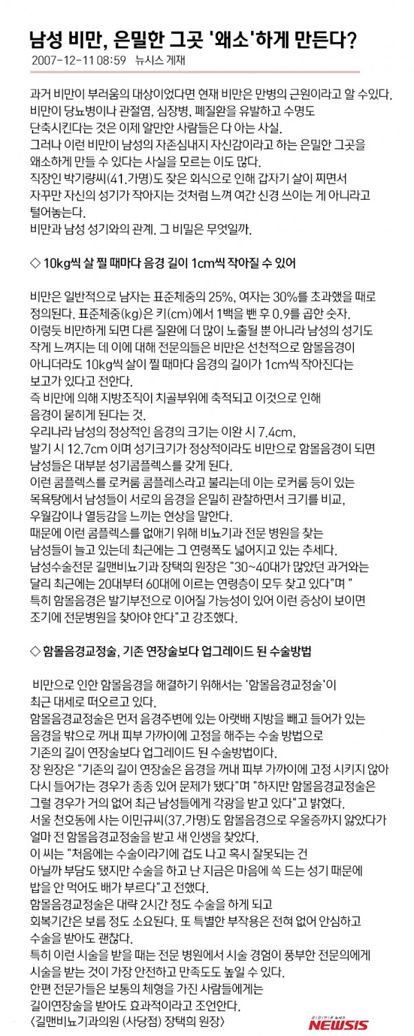 NO. 3 지점 작성일 2016.08.09 조회수 4,252 제목 남성비만, 은밀한 그곳 '왜소'하게 만든다? 관련링크 본문 2007년 12월 11일 뉴시스게제 이전글 다음글 목록보기